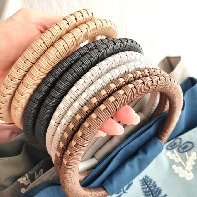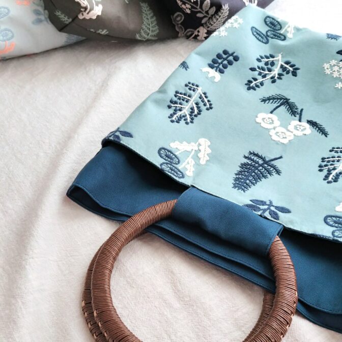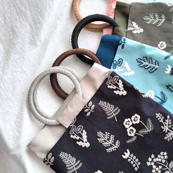 素敵な刺繍生地とクラフト丸持ち手の組み合わせにこだわりました。